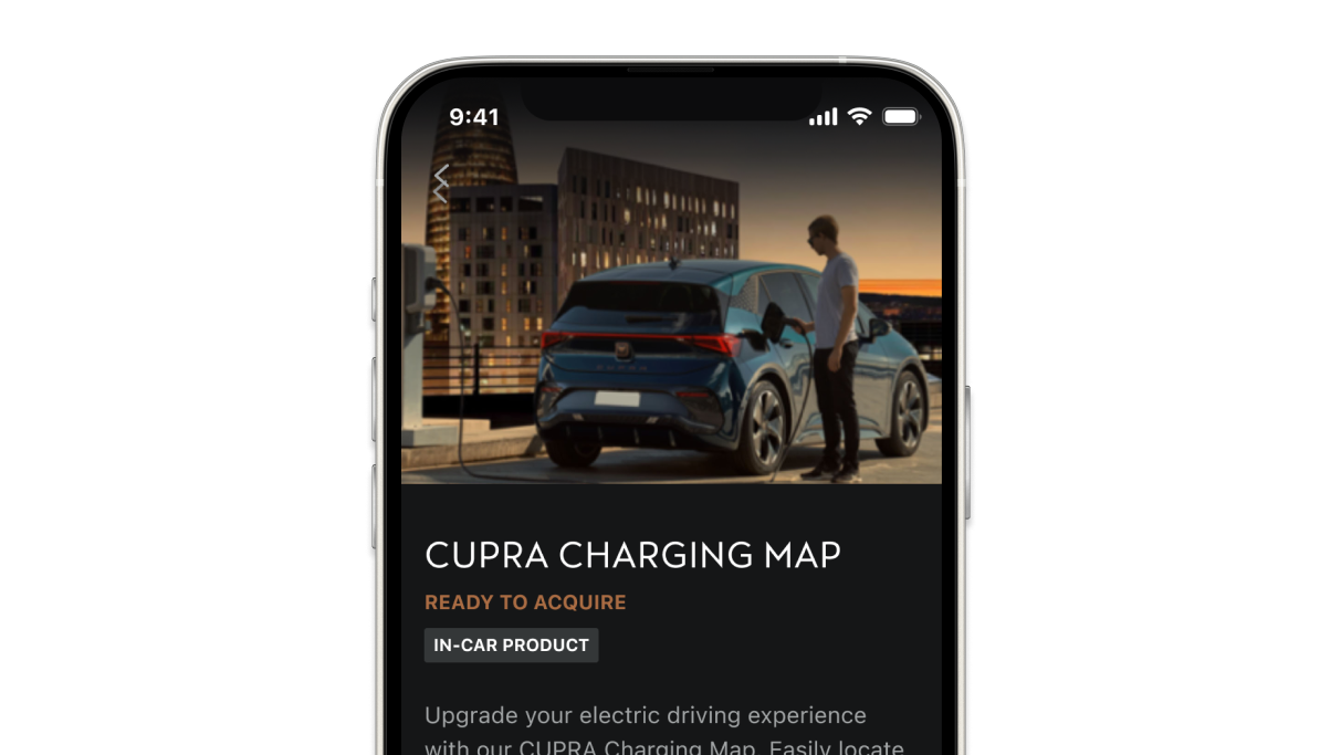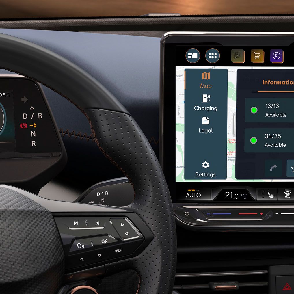 CUPRA Charging Map este o aplicație de infotainment care face parte din serviciile CUPRA CONNECT. Proiectată pentru dispozitive mobile și sistemul de infotainment, poate găsi stații de încărcare CUPRA în 27 de țări europene, permițând încărcarea convenabilă a vehiculelor CUPRA electrice și e-hybride.