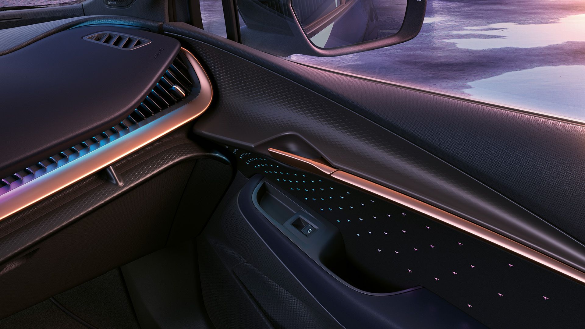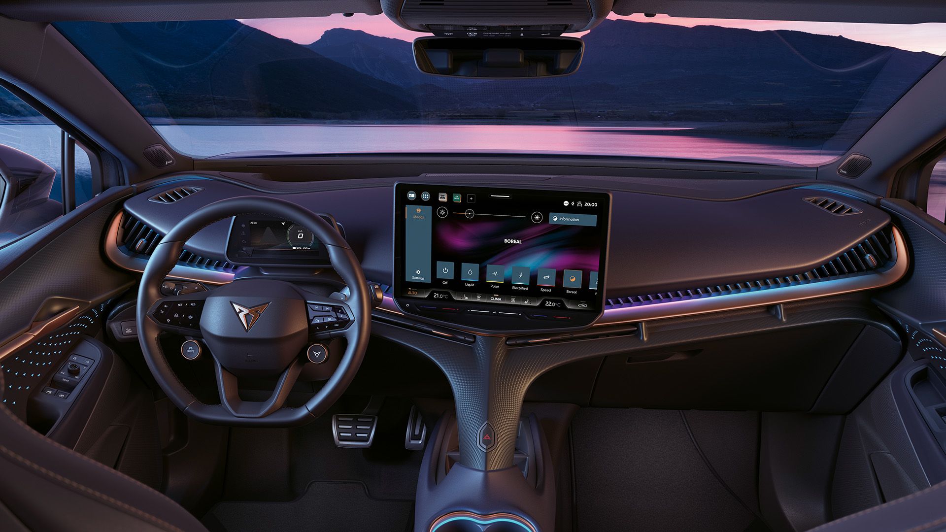 La intrarea în CUPRA Tavascan, lumina strălucește prin panourile perforate ale ușilor. Iluminarea se extinde peste tabloul de bord, suporturile pentru pahare și luminile de citit pentru pasager, care ameliorează oboseala ochilor.